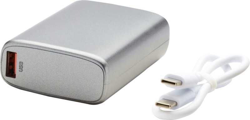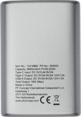 - Batterie de secours de 9 600 mAh avec alimentation rapide de 18 W, qui peut recharger complètement les appareils mobiles plusieurs fois. Indicateur de puissance qui indique le niveau d'énergie à tout moment. Entrée Type-C : CC 5 V / 2,4 A, 9 V / 2 A, sortie Type-C : CC 5 V / 3 A, 9 V / 2 A, 12 V / 1,5 A, sortie USB-A : CC 5 V / 3 A, 9 V / 2 A, 12 V / 1,5 A, Sortie totale : 18 W (max). Câble de charge Type-C à alimentation rapide en plastique TPE sans PVC inclus. Présentée dans un coffret cadeau Avenue. Plastique ABS