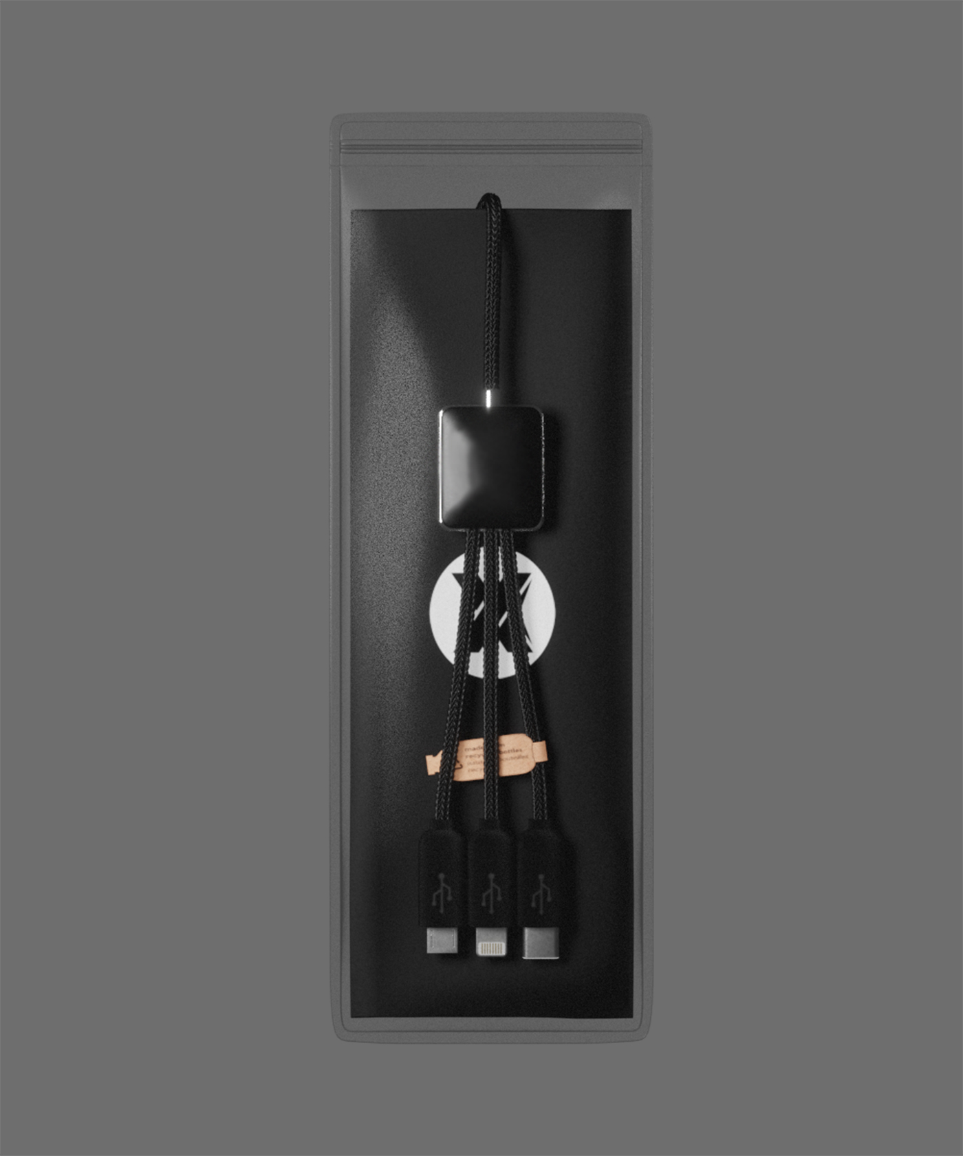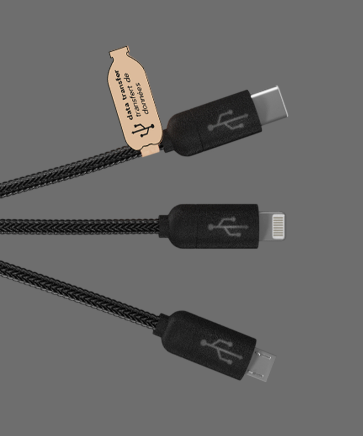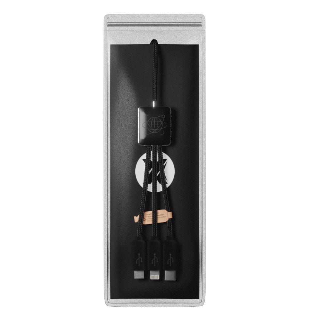 - Câble d'un mètre avec double logo lumineux recto/verso pour type C, iPhone et Android. Les cordons sont fabriqués en rPET (plastique issu de bouteilles recyclées). La double entrée USB-A + USB-C permet au câble d'être universellement compatible avec les derniers modèles d'ordinateurs (MacBook). Le câble permet le transfert de données vers des ordinateurs. Le câble peut également être utilisé avec les téléphones Android pour les applications de type Android Auto OS. Attention, ce câble n'est pas compatible avec Apple CarPlay. Finition métal, rubber soft touch sur l'import / ABS satiné sur le stock. Le câble peut charger plusieurs appareils en même temps. Tout est inclus : personnalisation recto/verso et pochette biodégradable avec cartonnette