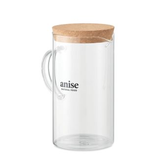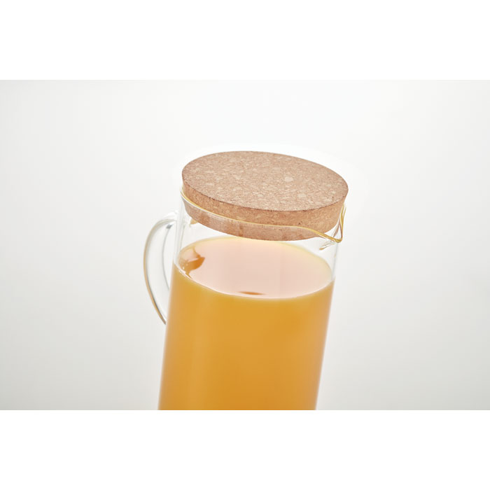 - Carafe à eau ou à jus en verre borosilicate avec couvercle en liège. Présentez des jus de fruits frais, de la limonade, de l'eau ou d'autres boissons dans cette carafe en verre. Comme elle est fabriquée en verre borosilicate, elle peut également contenir des liquides chauds. Le couvercle en liège donne à la carafe un aspect naturel