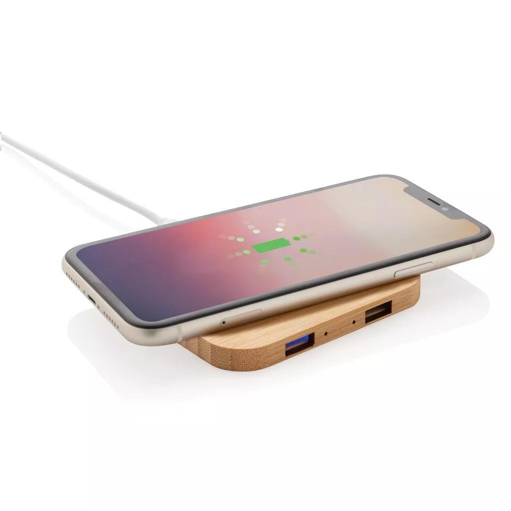 Chargeur sans fil de 5W en bambou certifié FSC®100% avec deux ports USB intégrés. Compatible avec tous les appareils compatibles QI comme Android dernière génération, Iphone 8 et plus. Entrée: 5V/2A. Sortie USB : 5V/2A. Induction : 5V/1A - 5W. Article et accessoires 100% sans PVC. Emballé dans une boite FSC®Mix. Câble micro USB en TPE recyclé RCS de 150 cm inclus