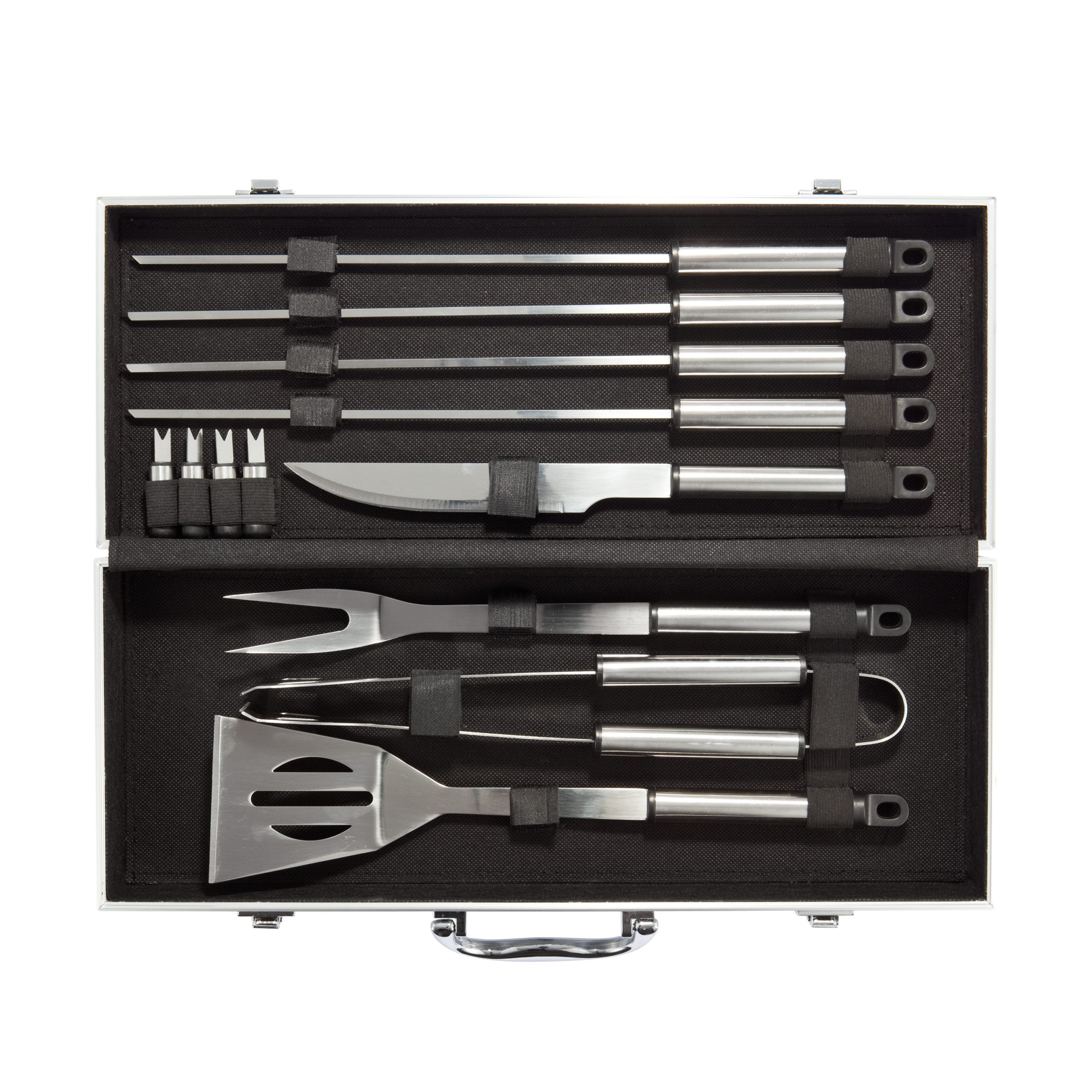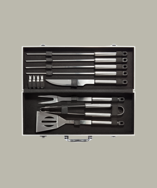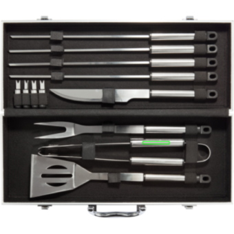 Set de 12 accessoires en acier inoxydable pour barbecue comprenant 4 brochettes, 1 couteau à découper, 4 supports à maïs, 1 spatule, 1 fourchette à découper et 1 pince. Livré dans un coffret aluminium avec poignée et système de fermeture