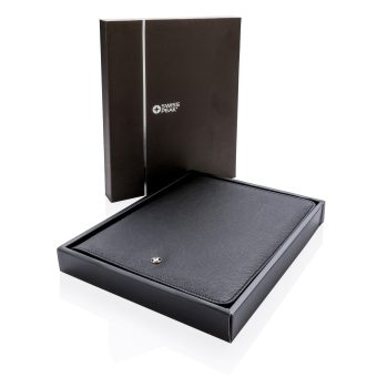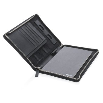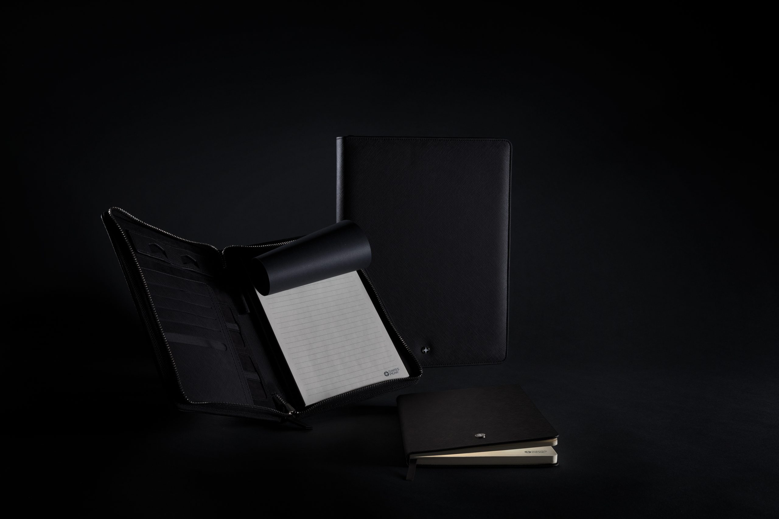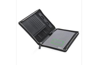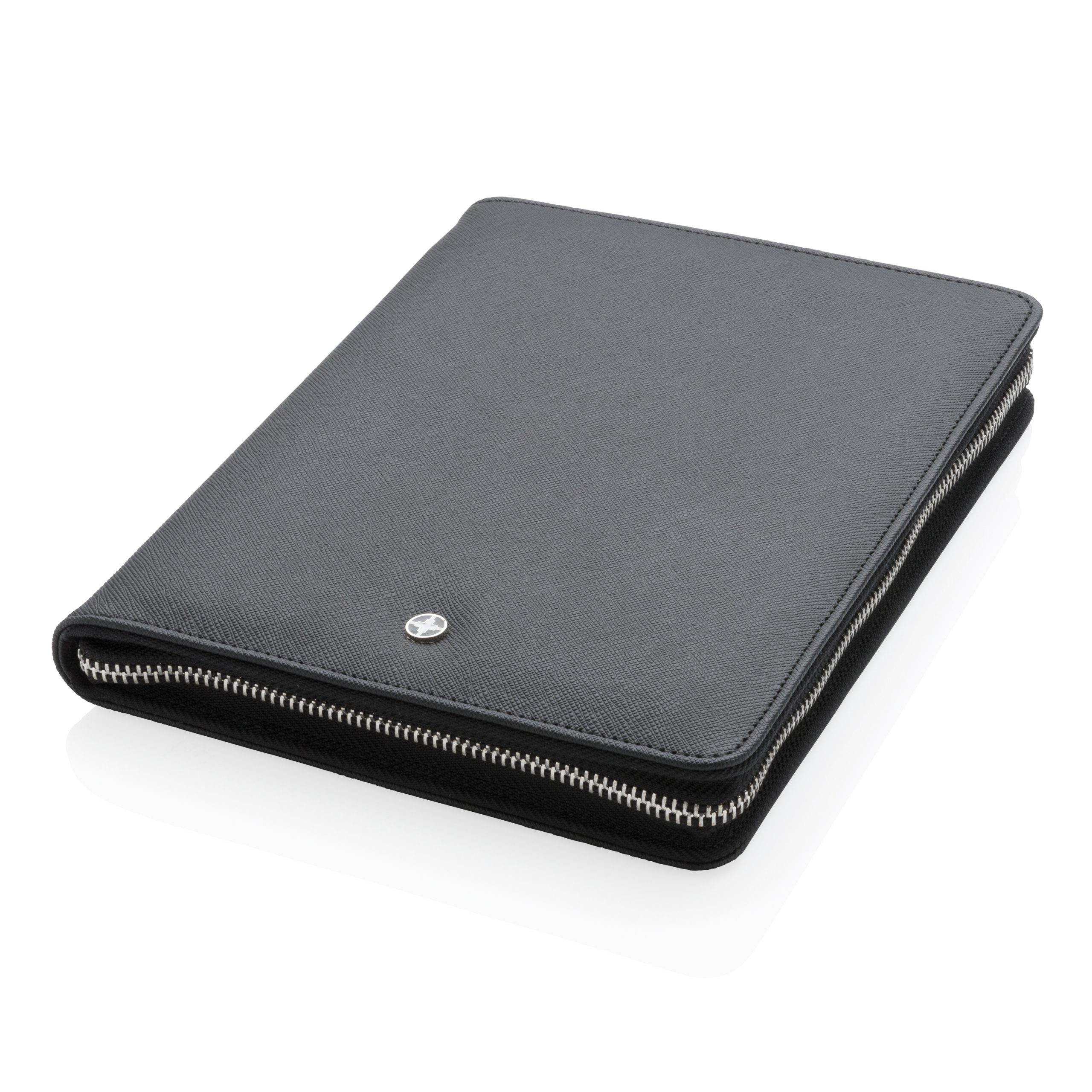 - Conférencier A5 avec couverture en PU simili cuir texturé et fermeture à zip. L’intérieur est composé d’un porte tablette/téléphone, porte gadgets, porte cartes, pochettes pour vos notes et papiers. Bloc-notes A5 inclus