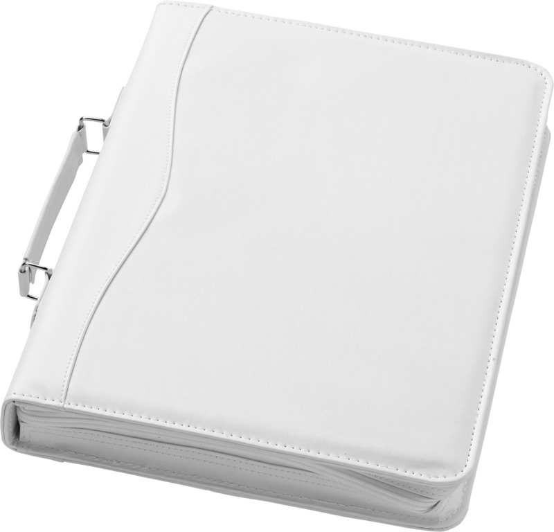 Conférencier zippé avec poignée, passant pour stylo, reliure à anneaux, poche zippée et compartiments pour documents. Bloc-notes de 20 pages à lignes fourni. Stylo et accessoires non fournis. PU.
