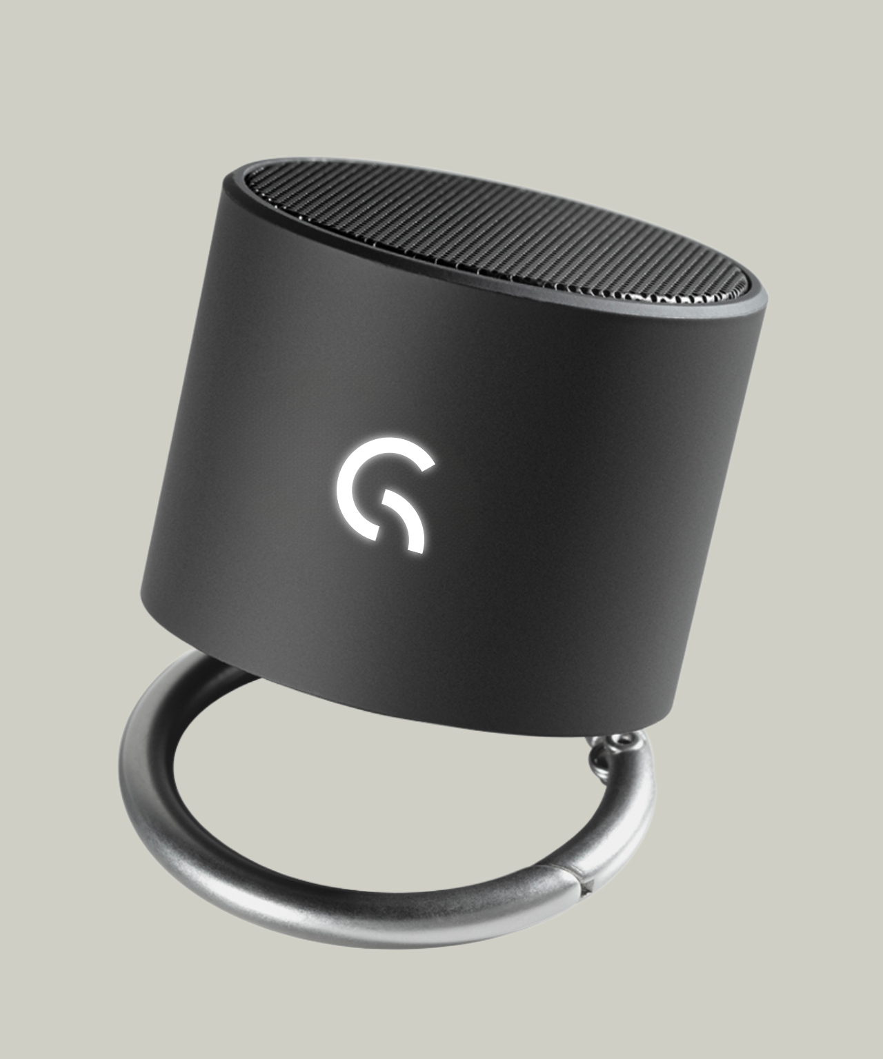 L'anneau est un mousqueton inclinable pour diffuser le son dans une direction donnée. Sa double sortie sonore produit un effet stéréo.