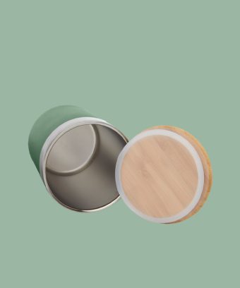 Gobelet isotherme à double paroi avec couche de cuivre, au design moderne, et avec un couvercle en bambou biologique