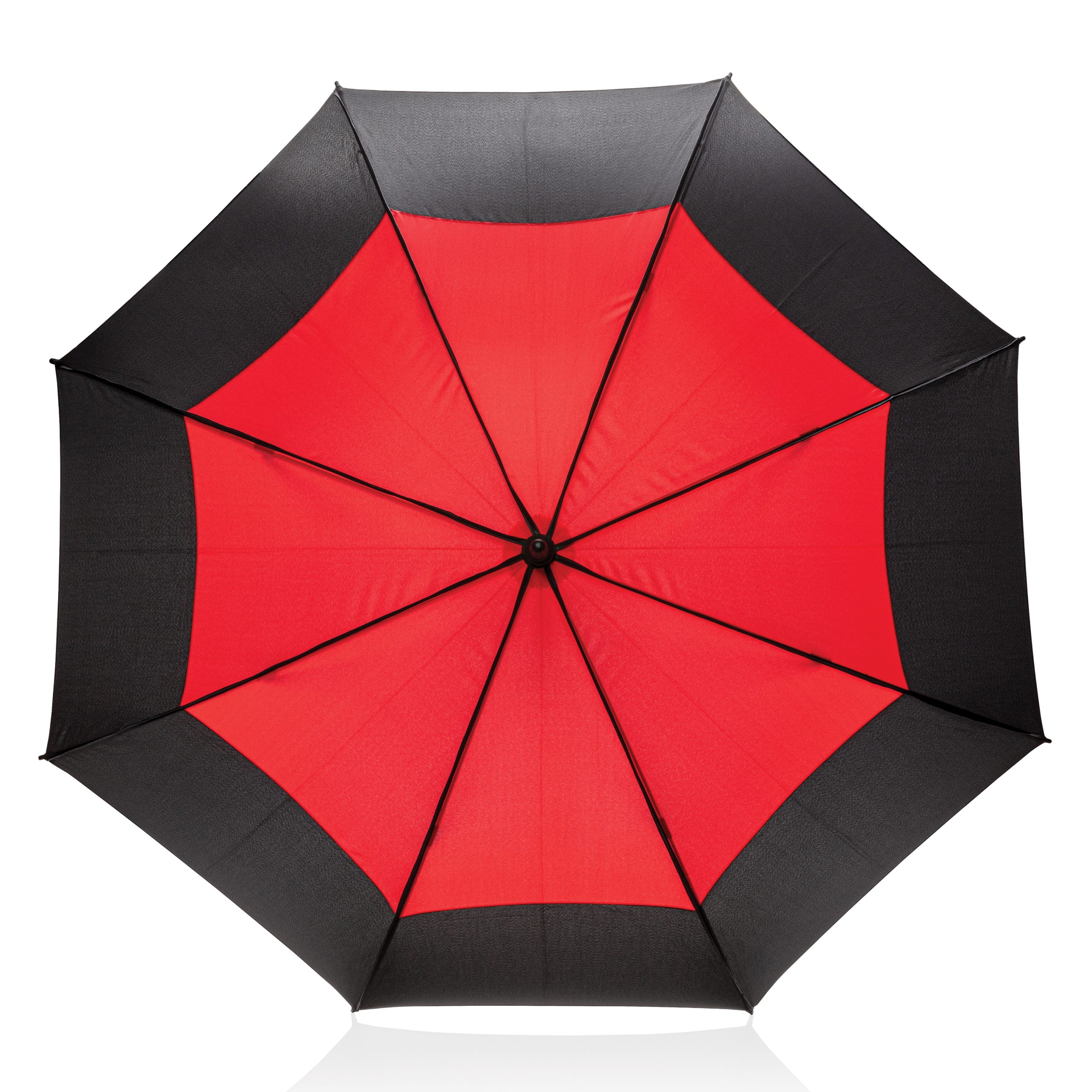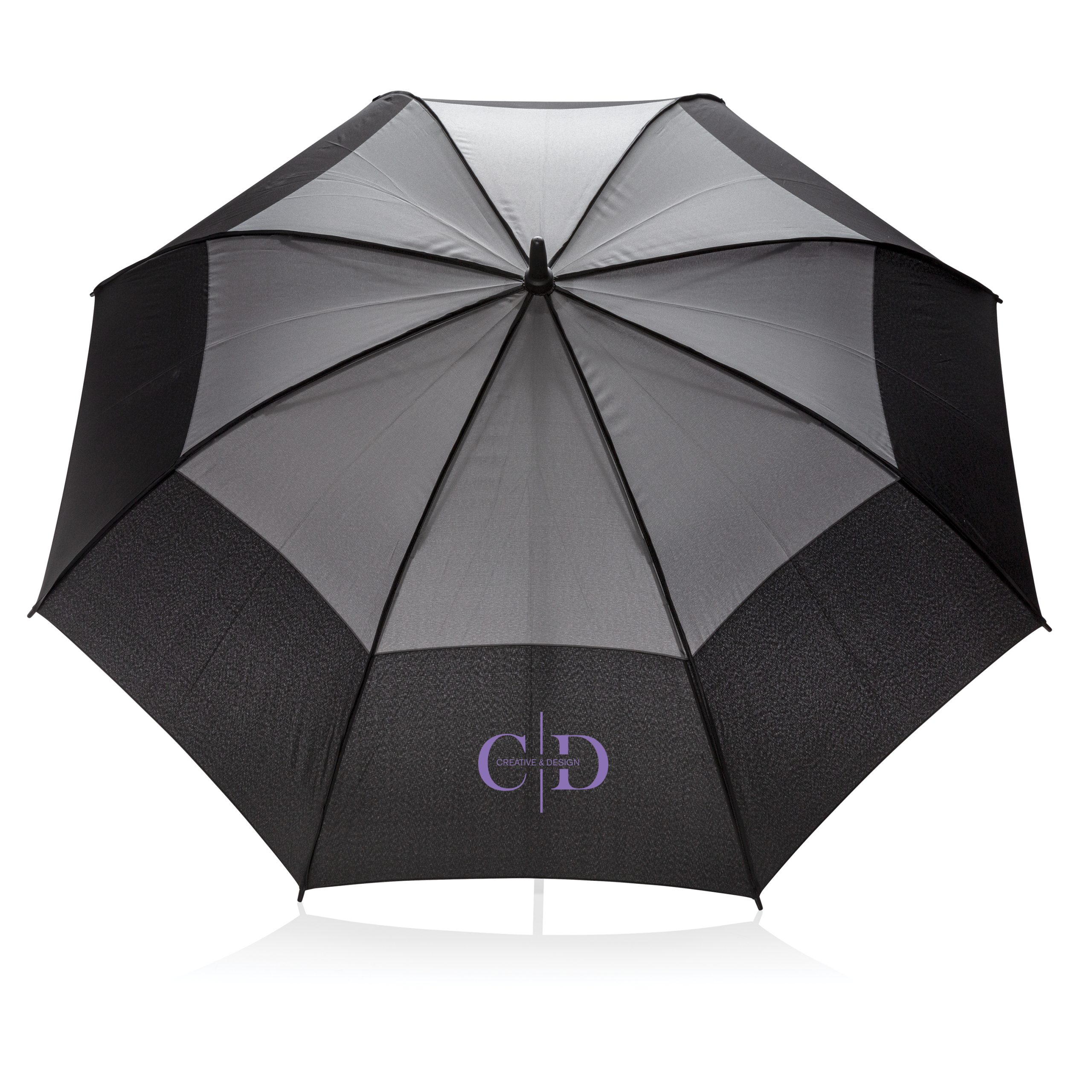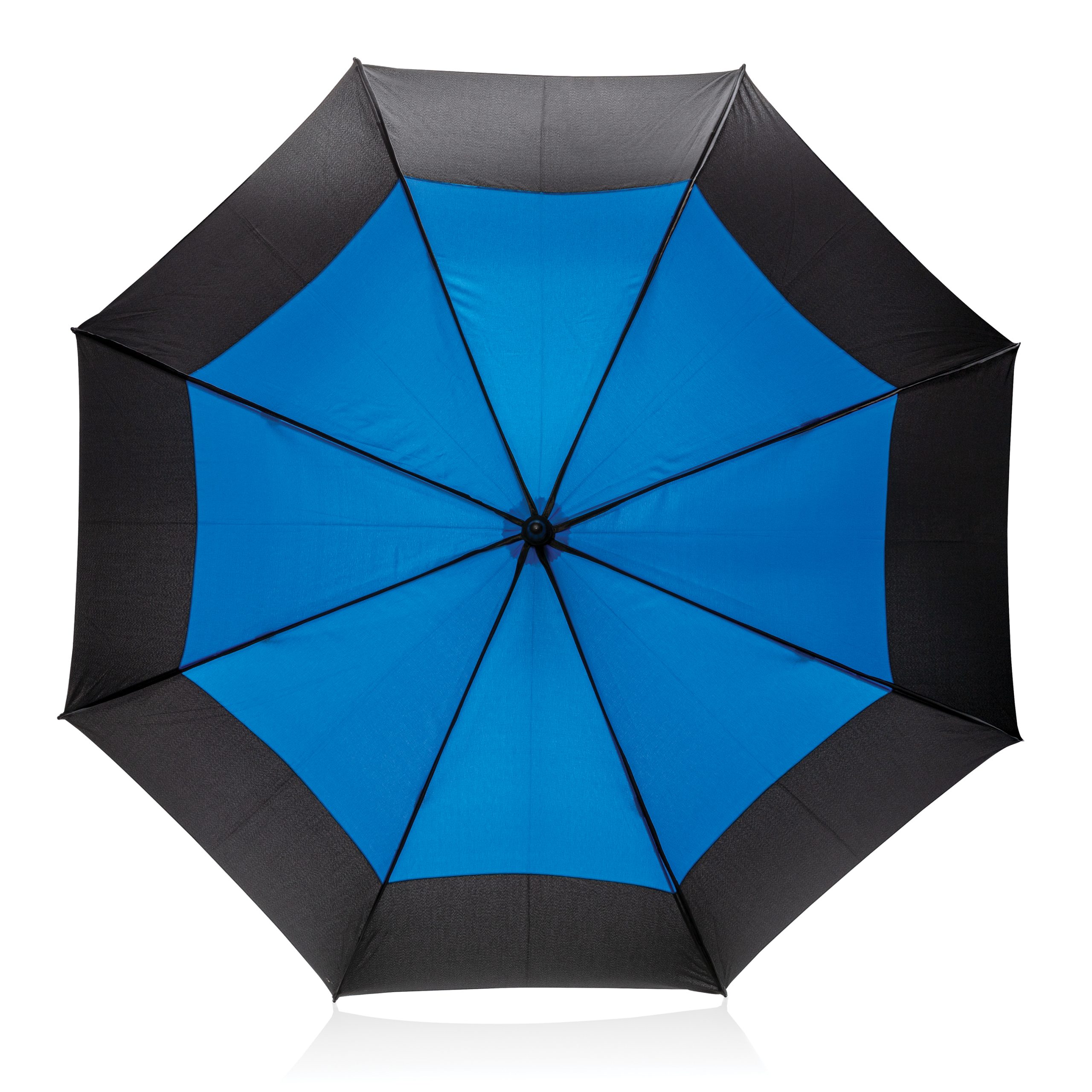 Parapluie tempête 27'' en tissu pongé 190T avec système d'ouverture automatique. Système coupe-vent. Avec poignée droite et baleines en fibre de verre