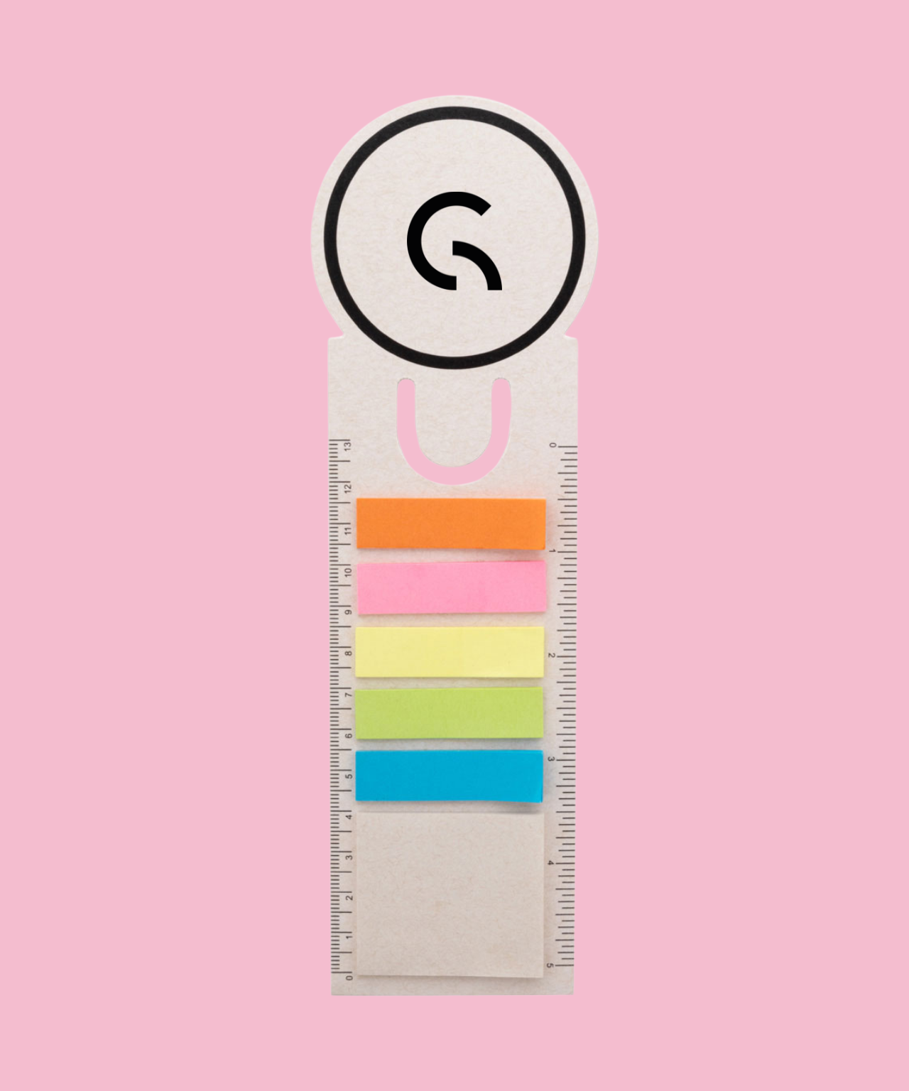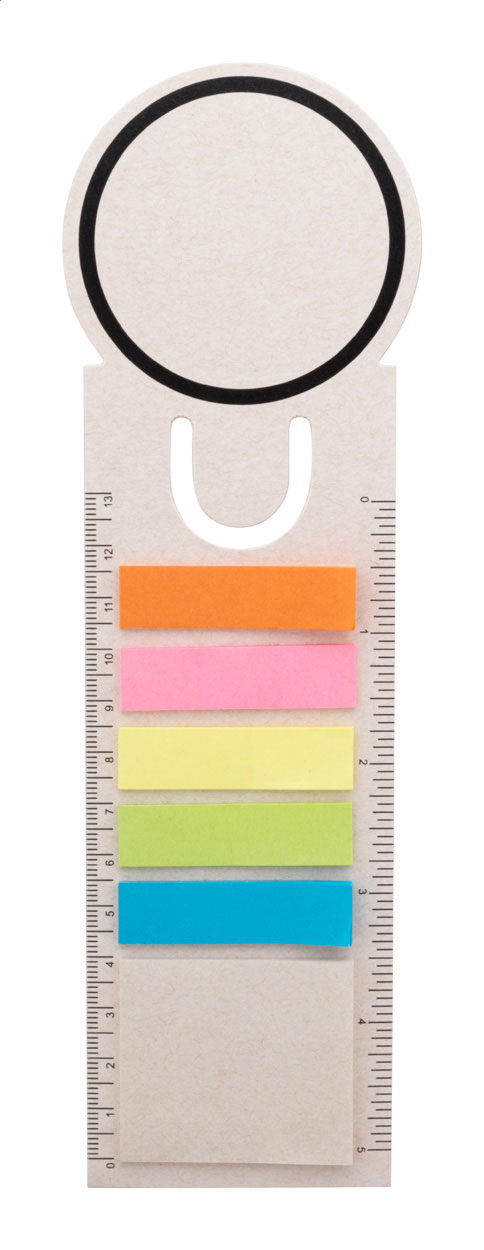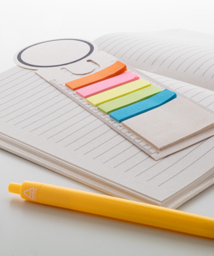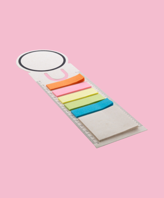 - Marque-page et règle en carton de lait recyclé avec 15 notes autocollantes et 75 marque-pages (en 5 couleurs différentes)