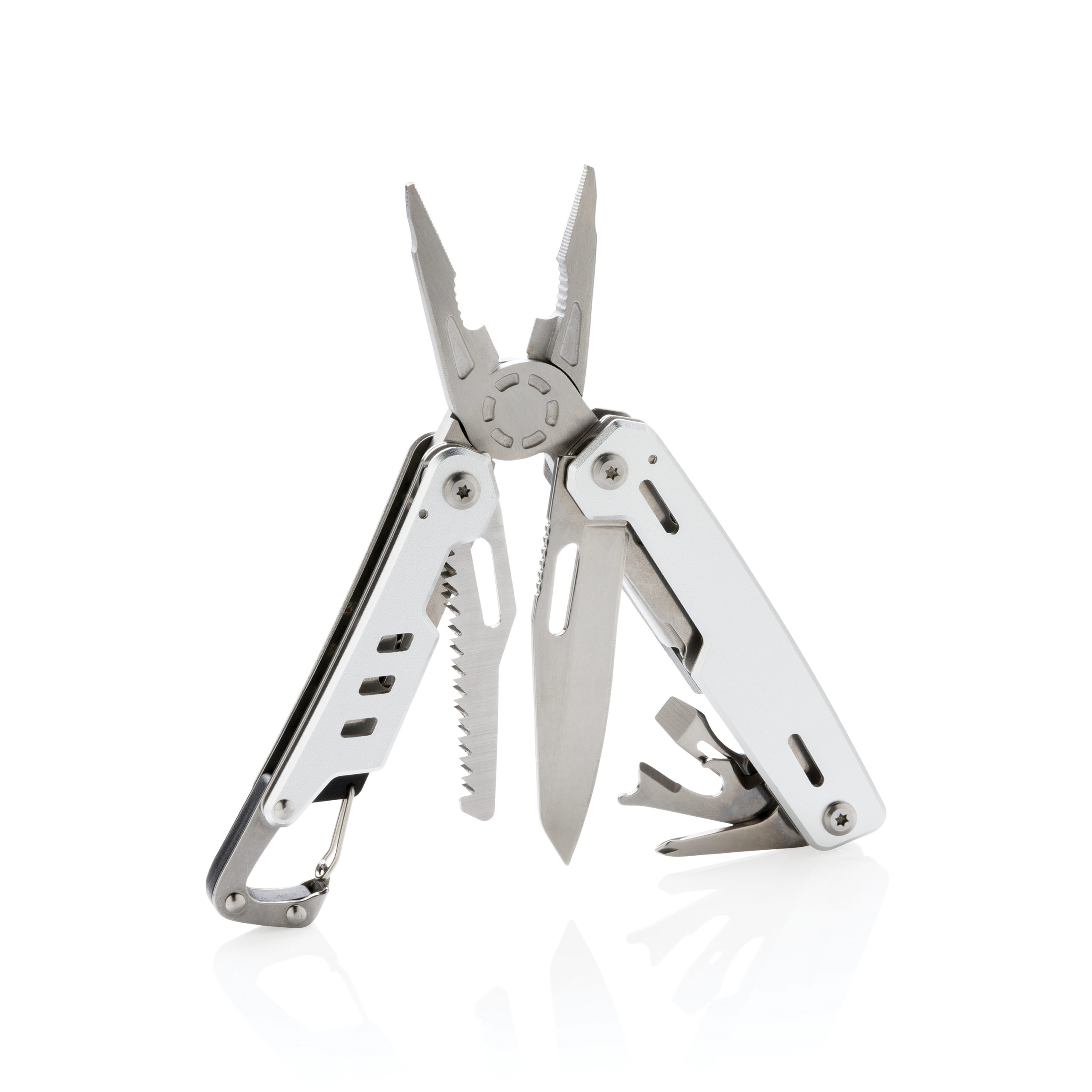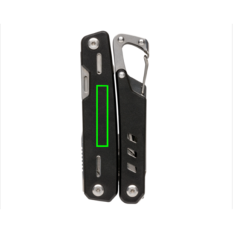 Outil multifonctions robuste en aluminium avec 11 fonctions. Les outils en acier inoxydable sont: pince à bec, pince, pince coupante, couteau, tournevis cruciforme, tournevis plat, scie, ouvre-boîte, ouvre-bouteille, décapsuleur, mousqueton, pince à dénu