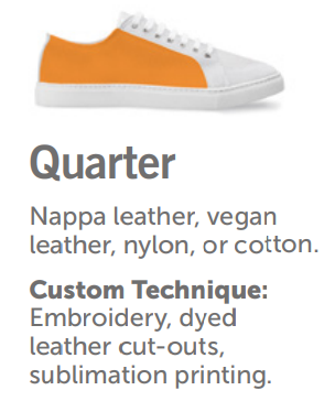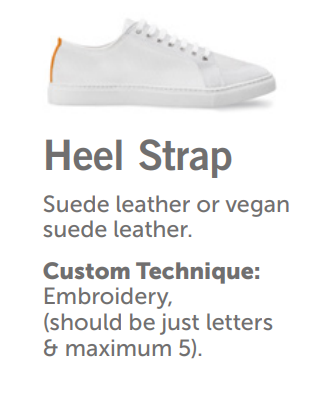 Teinture, zone latérale Impression par sublimation, zone latérale Broderie, zone latérale Broderie, talon (5 lettres max.)