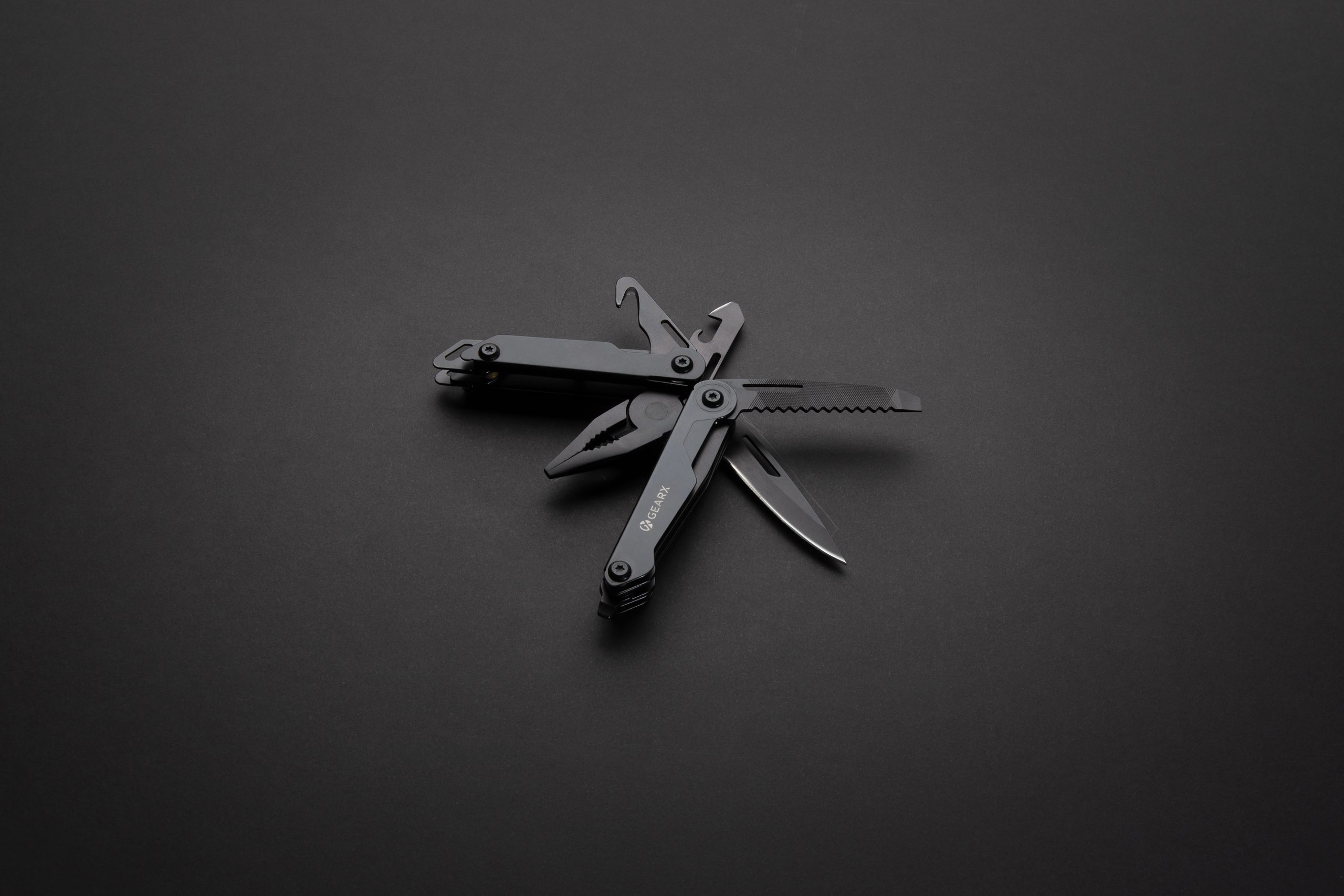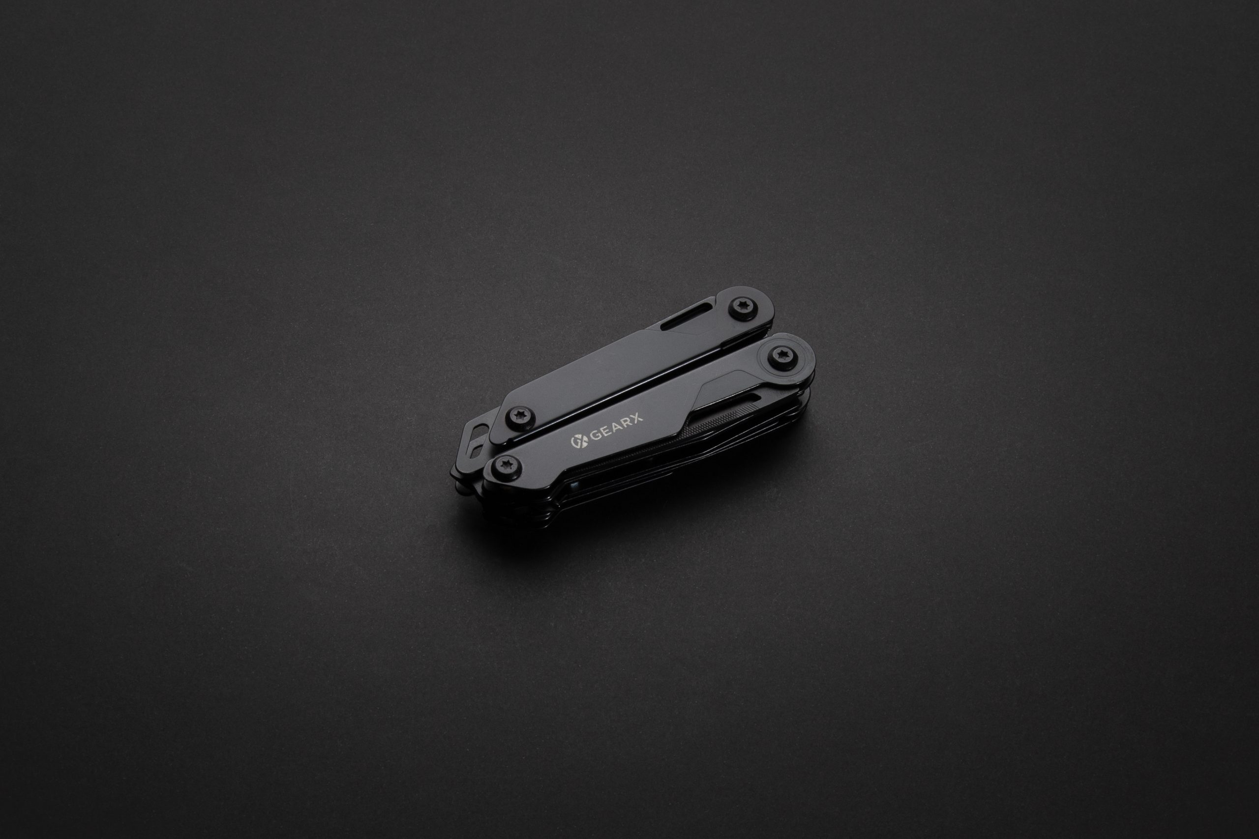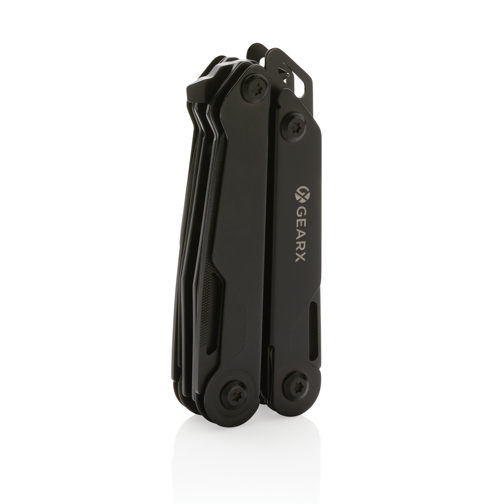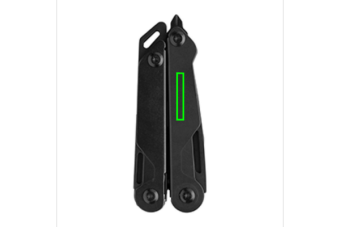 - Pince polyvalente avec corps en aluminium et assorti d'outils en acier inoxydable 420, le tout entièrement noir. Les 13 fonctions sont: Couteau (avec cran d’arrêt), lime, scie, grand tournevis plat (avec cran d’arrêt), tournevis cruciforme, tournevis plat, pinces, pinces standard, coupe-fil, décapsuleur, tournevis, coupe-ceinture de sécurité, coupe-boîte. Emballé dans une boîte cadeau de luxe