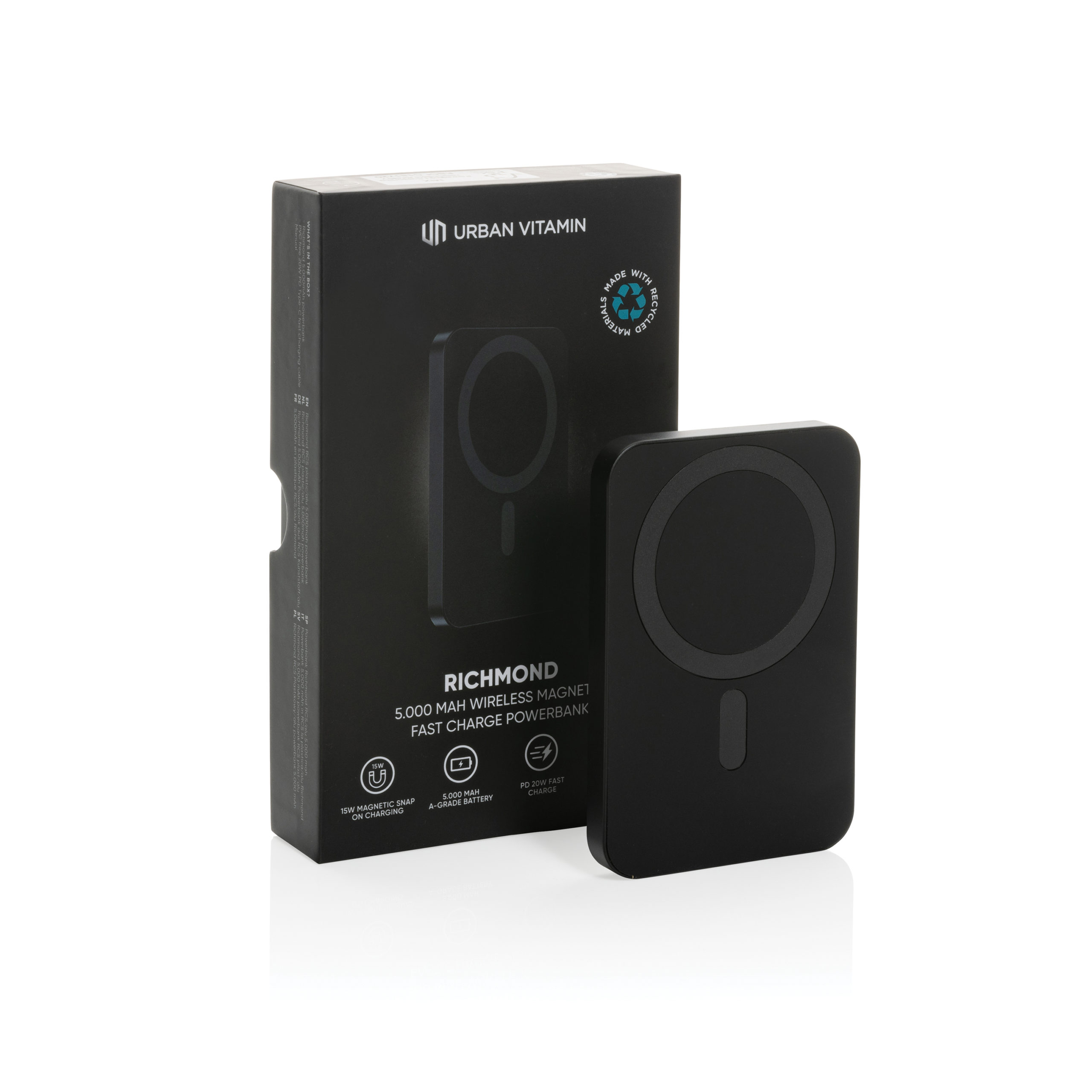 - La technologie magnétique de Richmond s'accroche sans effort à votre iPhone 12 et plus, ainsi qu'aux téléphones Android de nouvelle génération, assurant une connexion directe pour une charge de 15 W à la vitesse de l'éclair. Richmond permet la charge rapide à la vitesse de l'éclair de 20 W via son port Type-C, à la fois pour recharger le powerbank lui-même et pour surcharger votre appareil. Rien de plus simple : il suffit de cliquer sur Richmond sur votre téléphone et de regarder la magie opérer ! Notre conception intelligente lance automatiquement la charge dès qu'elle est fixée, garantissant que vos appareils sont toujours rechargés lorsque vous en avez besoin. Nous croyons en la qualité durable, c'est pourquoi Richmond est équipé d'une batterie de qualité 5000 mAh 100% cobalt. Cette batterie dure plus longtemps et est plus performante que les batteries au lithium ordinaires. Fabriqué avec de l'aluminium recyclé et de l'ABS certifiés RCS (Recycled Claim Standard)