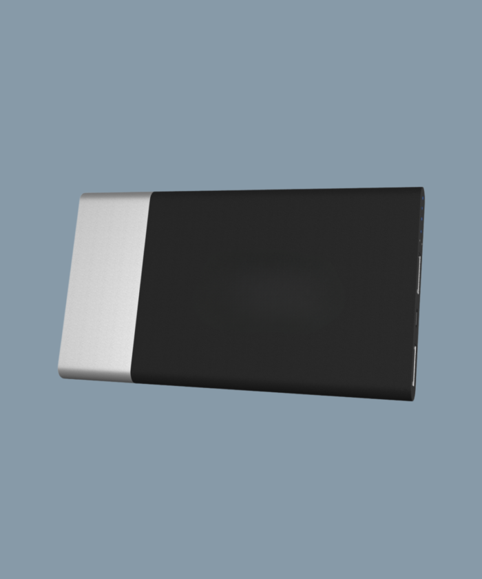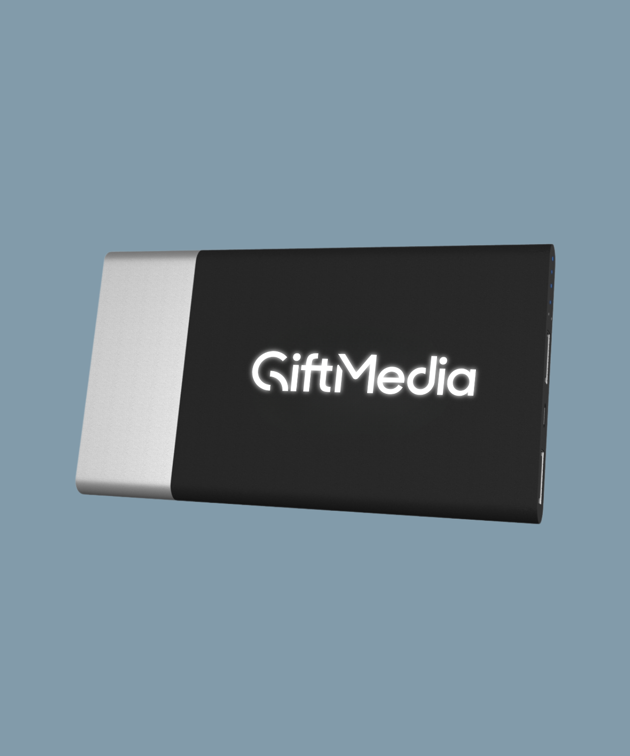 Powerbank en caoutchouc et métal, d'une capacité de 5000 mAh et d'une double sortie USB de 1,0 A et 2,1 A. Logo lumineux qui s'allume dès qu'on le touche grâce à la fonction shake.