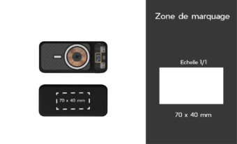 Marquage offset (option - marquage numérique avec logo lumineux intégré), avant article, format maxi 36x59 mm