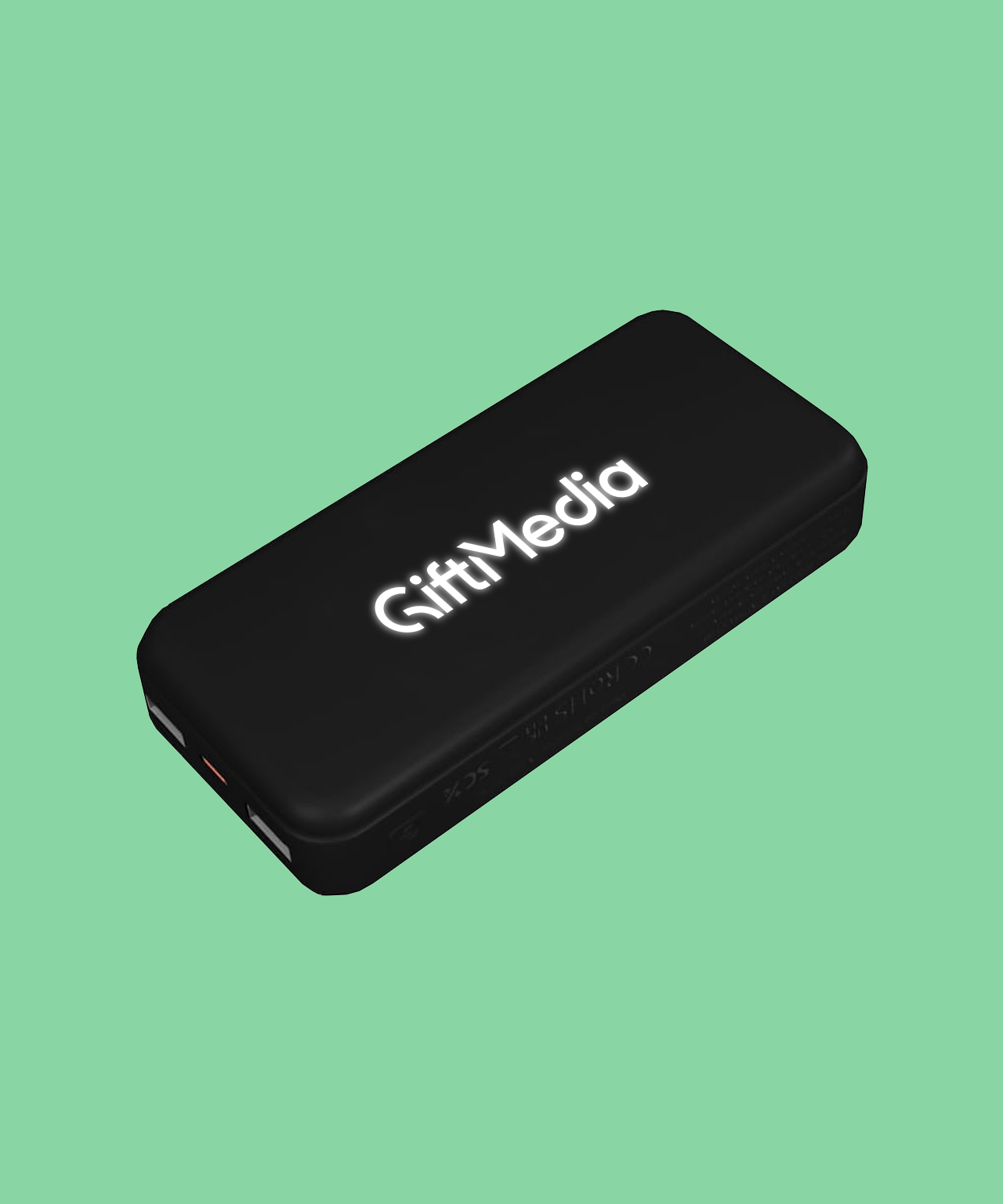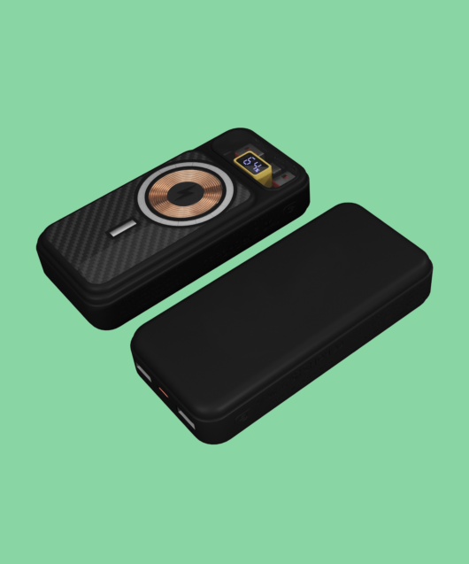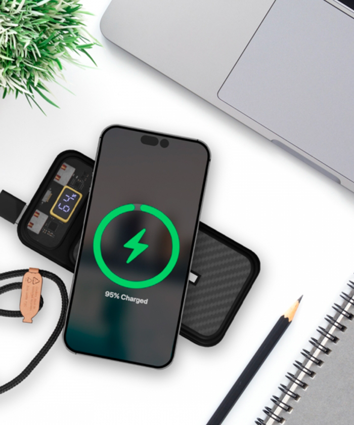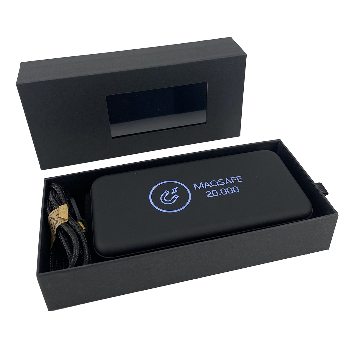 Powerbank magnetique induction de 20 000 mAh, compatible MagSafe (ou tous téléphones grâce à l’autocollant inclus), avec affichage numérique, logo lumineux et plusieurs ports pour charger tous vos appareils