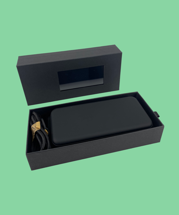 Tout est inclus : câble rPET 12V/5A, coffret cadeau en carton recyclé, logo lumineux et garantie de 3 ans. -