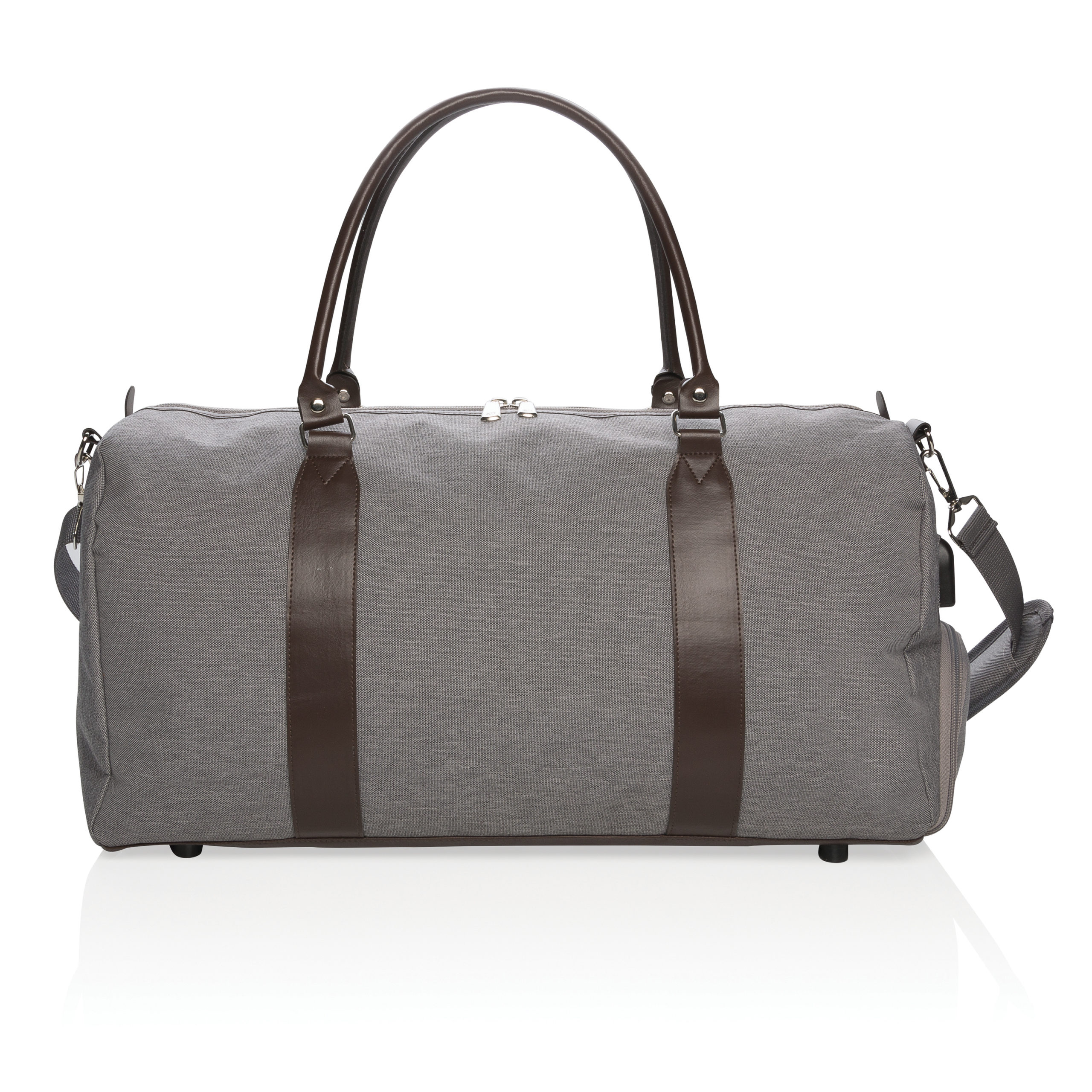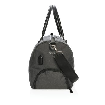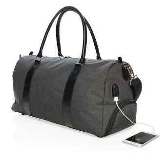 - Sac weekend 600D au design moderne et minimaliste avec poignées en PU et bandoulière confortable. Grand compartiment principal avec beaucoup d’espace. Connectez votre powerbank (non inclus) sur le port de chargement USB intégré et chargez votre téléphone ou tablette sur le trajet. Sans PVC.
