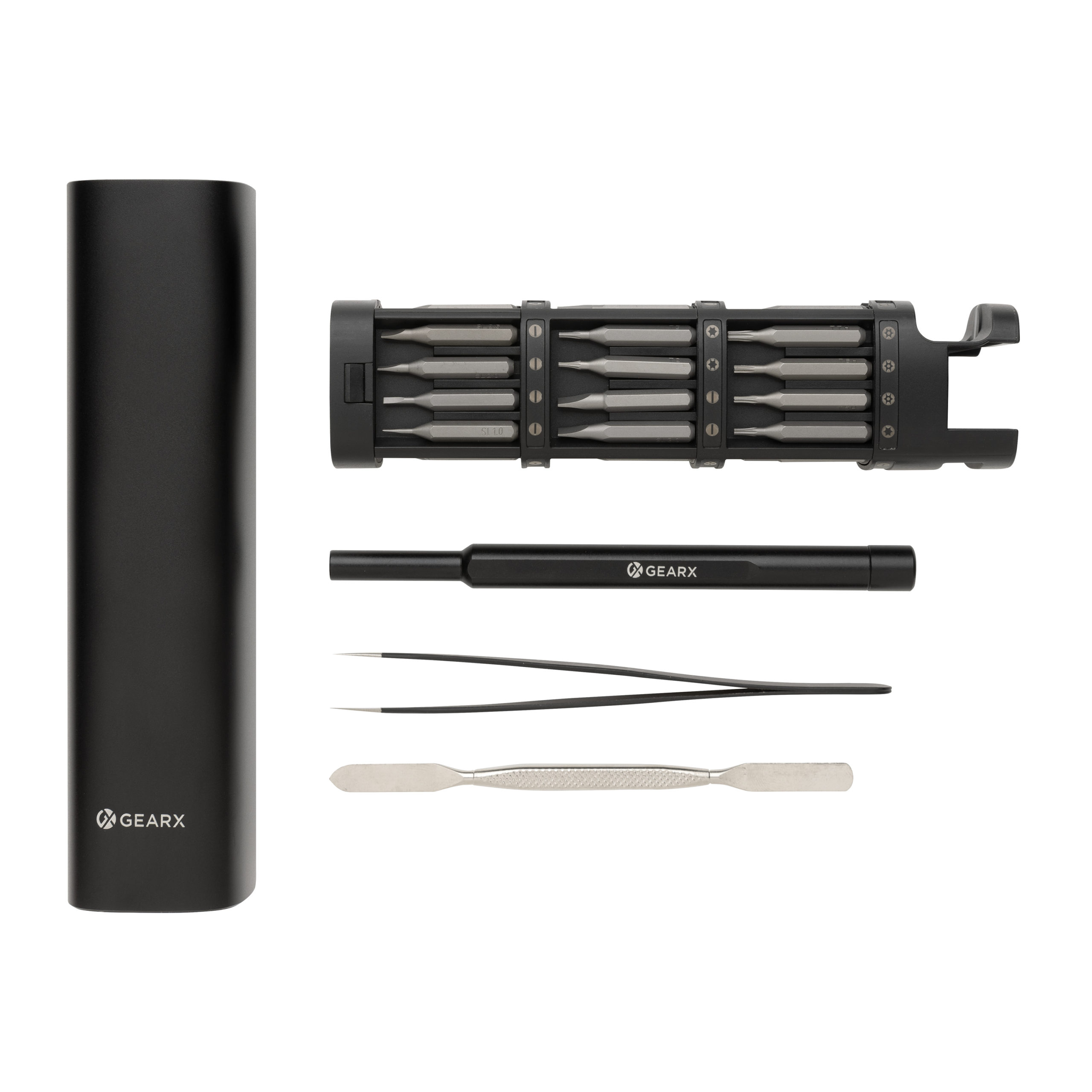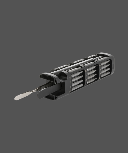 Rangé dans un coffret en aluminium recyclé certifié RCS (22 % de contenu recyclé), l’ensemble inclut un manche de tournevis, une pince à épiler et des embouts magnétiques faciles à manipuler