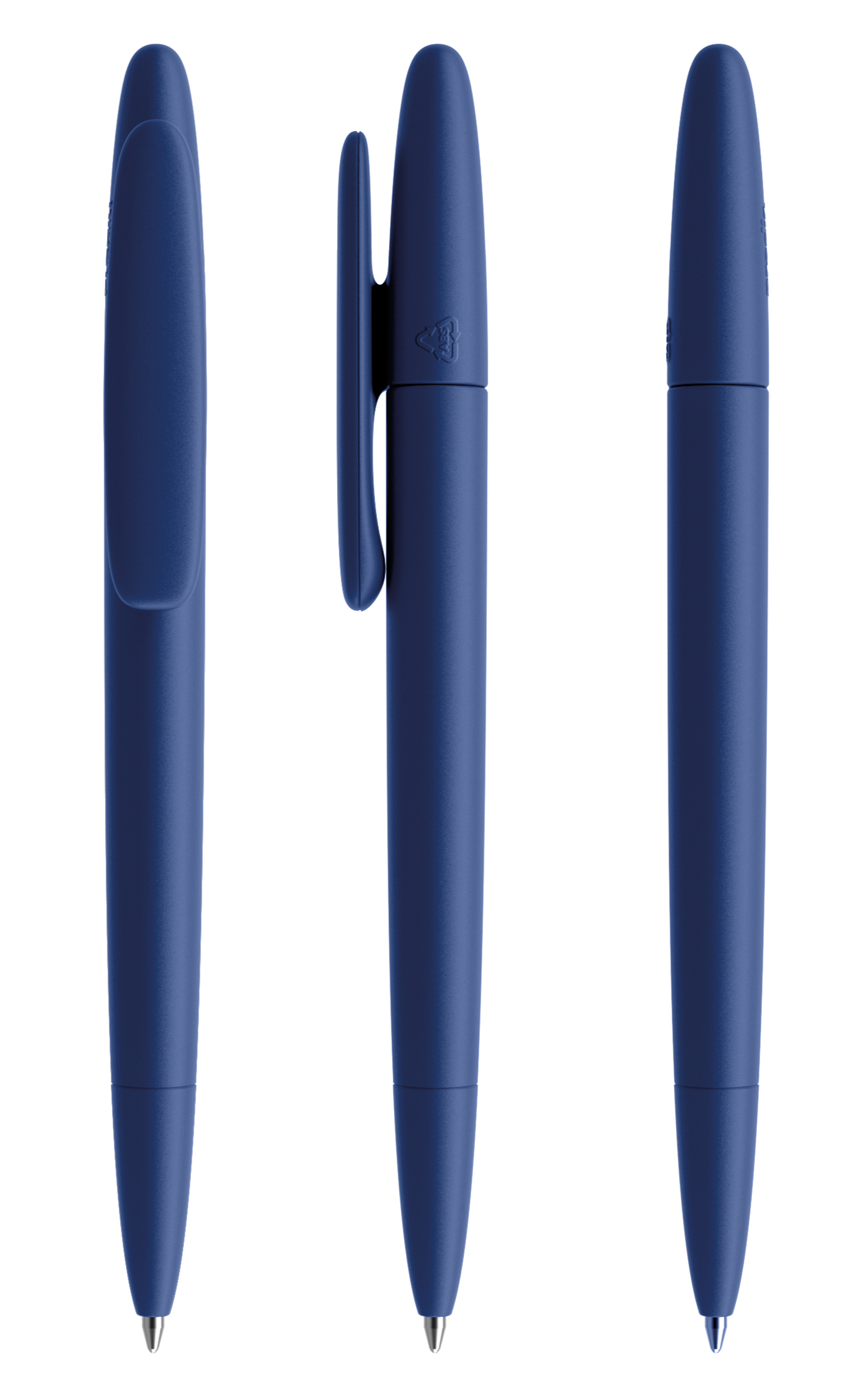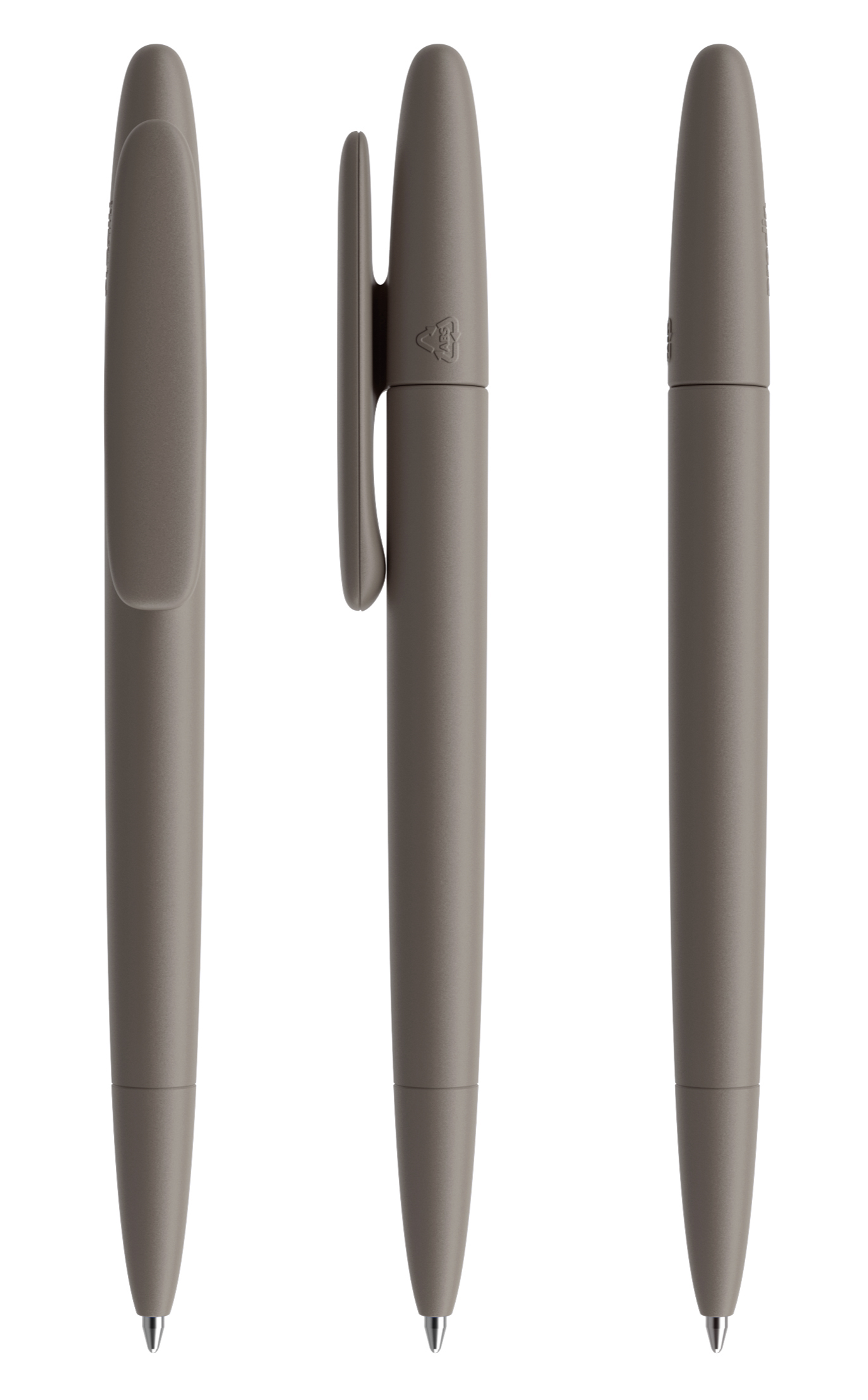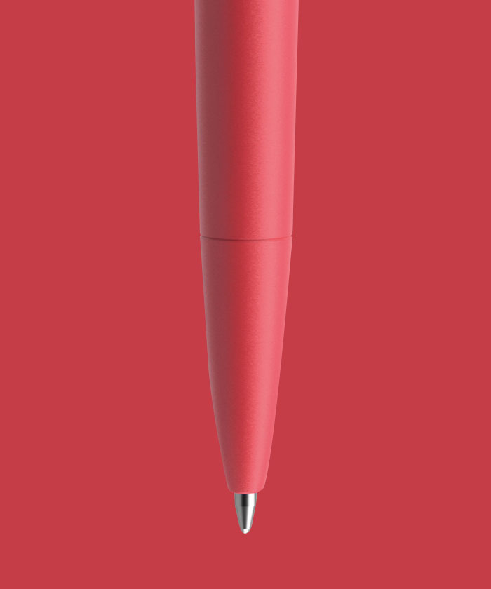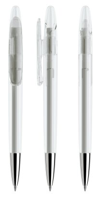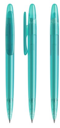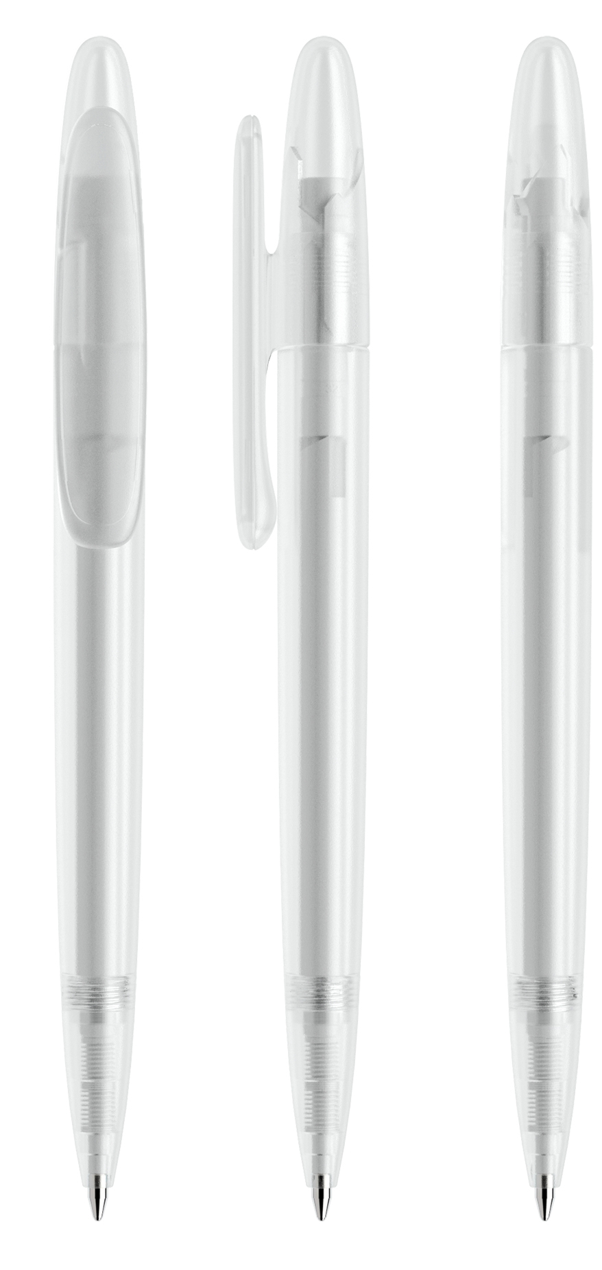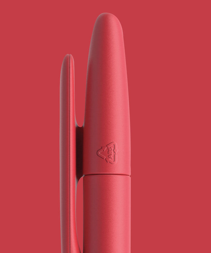 - Stylo à bille à poussoir et corps en plastique (ABS), composé à 30% de recyclat (standard) ou 100% (Regenerated). Version standard avec 30% de matériau recyclé disponible avec les surfaces givrée, transparente, mate, polie et mate vernie et dans de nombreuses couleurs. Également dans une haptique veloutée Soft touch. Couleurs spéciales PMS dès 10 000 pièces. Pointe en métal chromée ou satinée en option. Option Clip Cover exclusivement disponible pour la surface Soft touch. Mix & Match de couleurs sur une même surface. Cinq zones d'impression, agrafe imprimable en plusieurs couleurs (jusqu'à six).