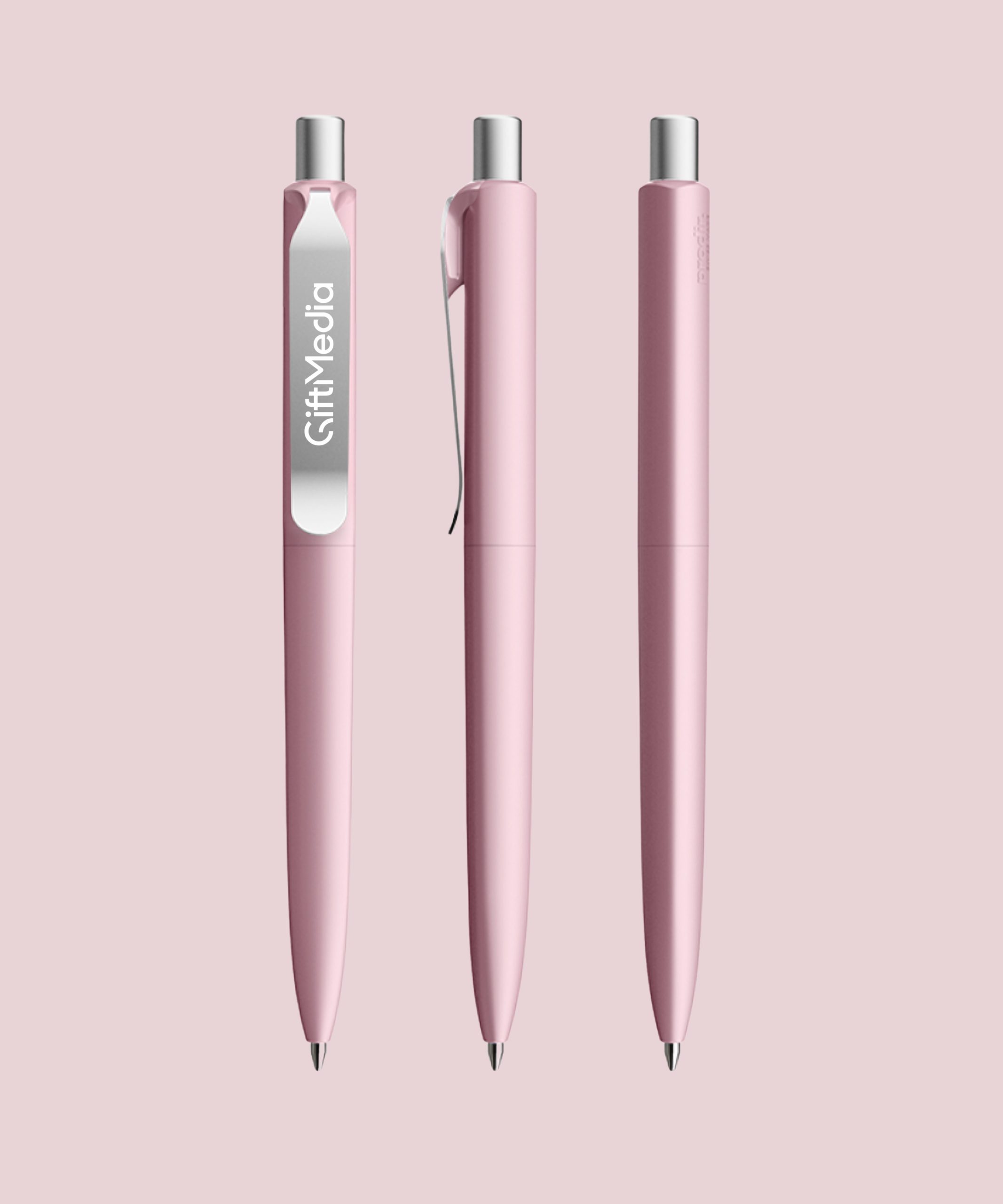 Versions standard disponibles dans différentes couleurs : sept mates, cinq polies et neuf veloutées Soft touch. Couleurs spéciales PMS dès 5 000 pièces. Agrafe métallique en quatre finitions, du cuivre au graphite. Support d'agrafe poli possible dans une autre couleur