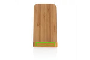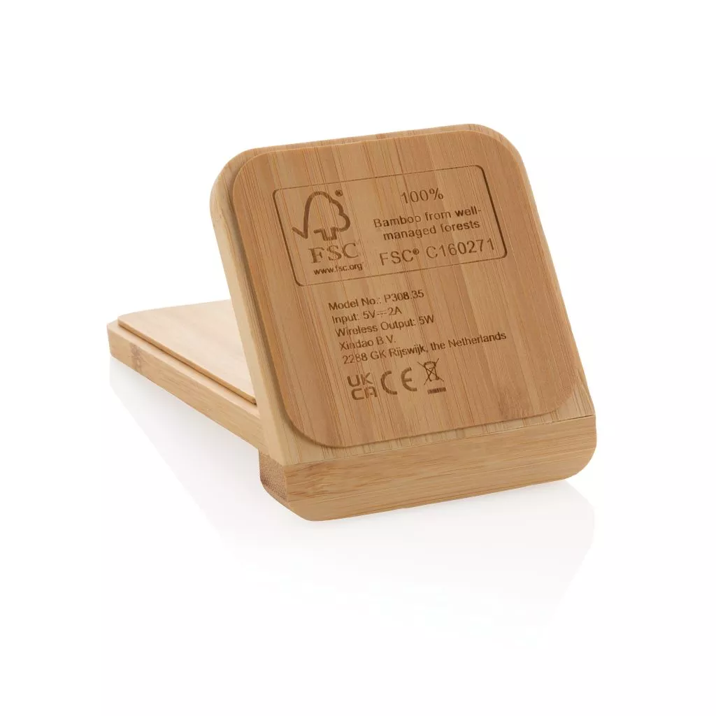 - Support avec chargeur sans fil 5W en bambou certifié FSC 100%. Compatible avec tous les appareils compatibles QI comme Android dernière génération, Iphone 8 et plus. Entrée: 5V/2A. Induction : 5V/1A - 5W. Article et accessoires 100% sans PVC. Emballé dans une boite FSC Mix. Câble micro USB en TPE recyclé RCS de 150 cm inclus