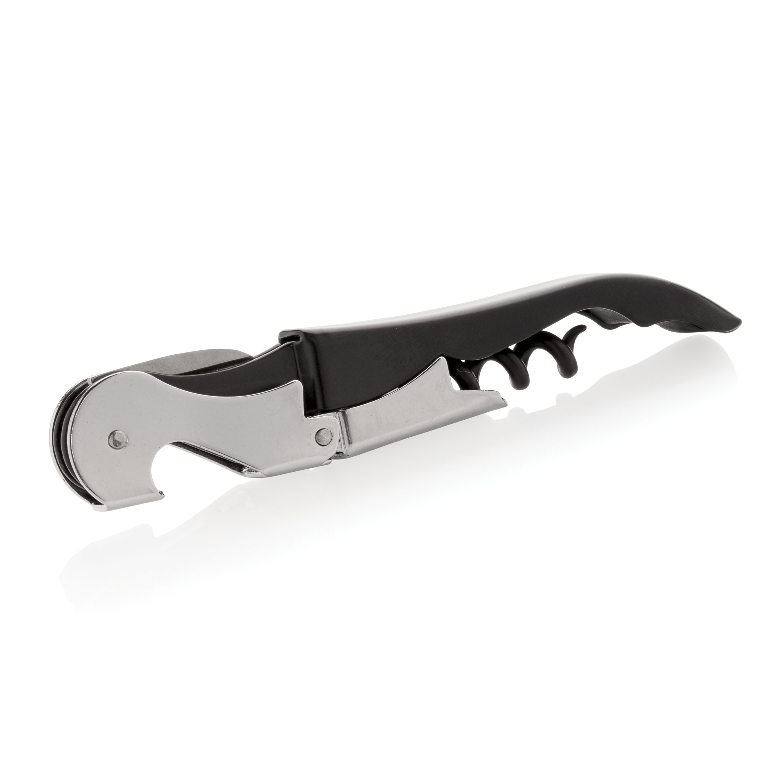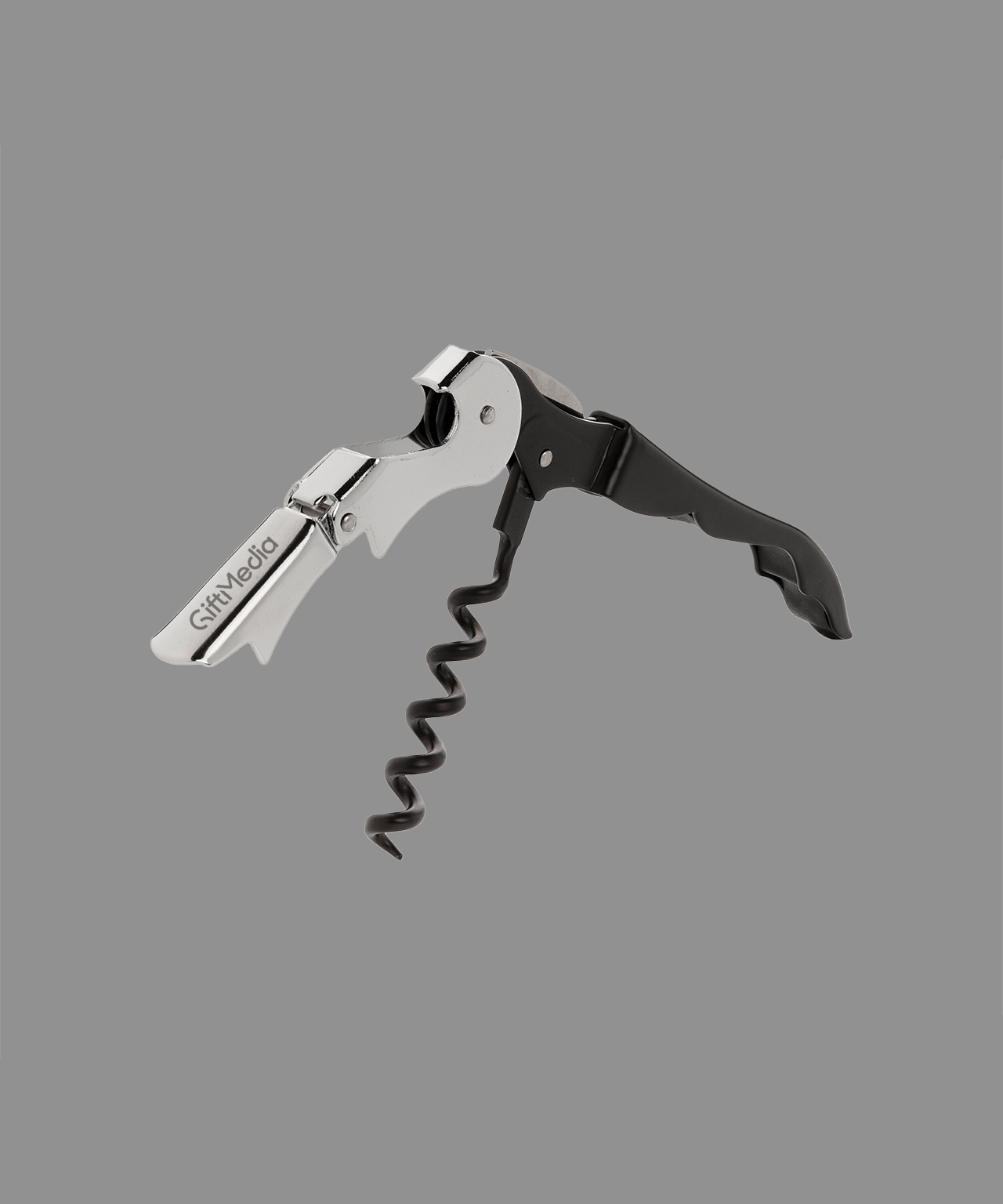 Tire-bouchon de serveur avec une lame de coupe capsule, d'un système d'ouverture à double levier et d'un décapsuleur. Emballé dans une boîte cadeau.