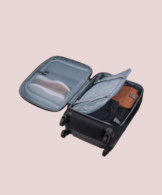 Valise cabine noire à coque souple, roulettes silencieuses, poignée télescopique en V, poche extérieure à accès rapide, séparateur pliable et panneau de compression amovible