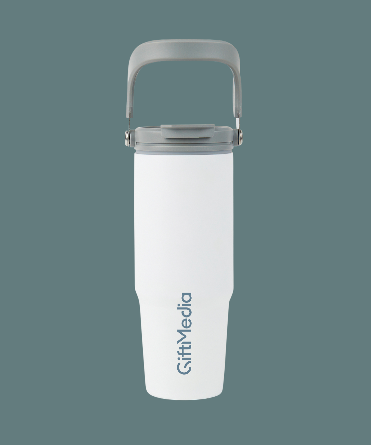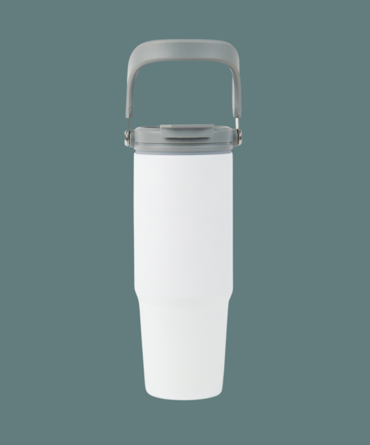 La bouteille est dotée d'une poignée fonctionnelle pour faciliter le transport, et le couvercle offre deux options de prise de boisson
