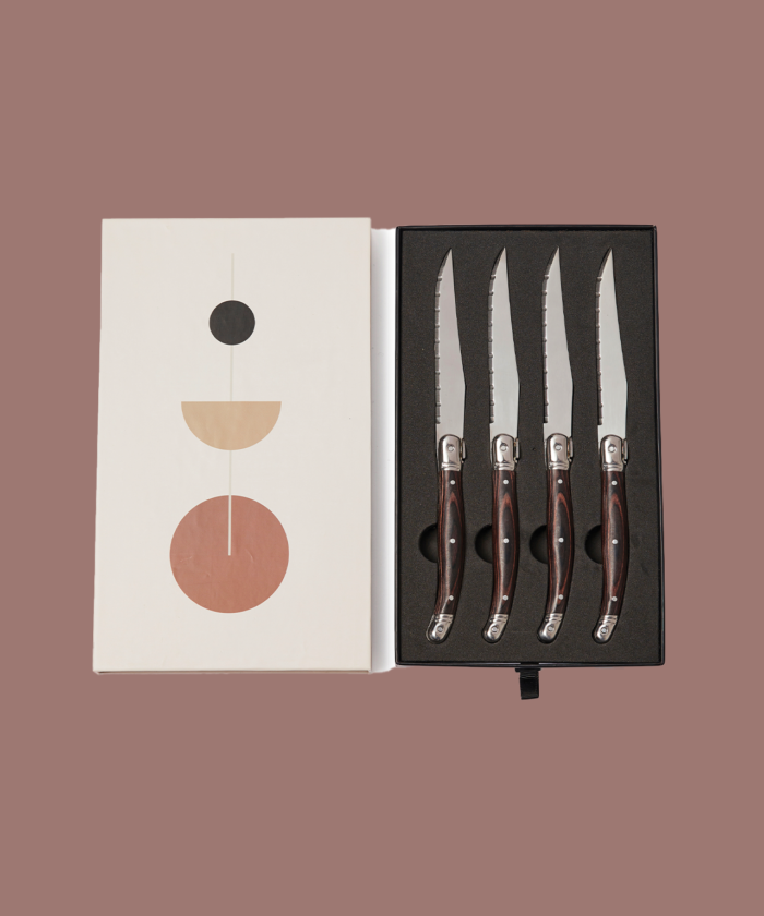 - Couteaux à viande de haute qualité dans un style bistro typique d'inspiration française. Manche en pakkawood noir et lames en acier inoxydable de haute qualité. La lame est dotée d'une râpe fine qui vous permet de couper les aliments avec le moins de résistance possible. Un ensemble de quatre couteaux que vous pouvez facilement assortir à vos fourchettes à la maison. Emballé dans une boîte cadeau exclusive.